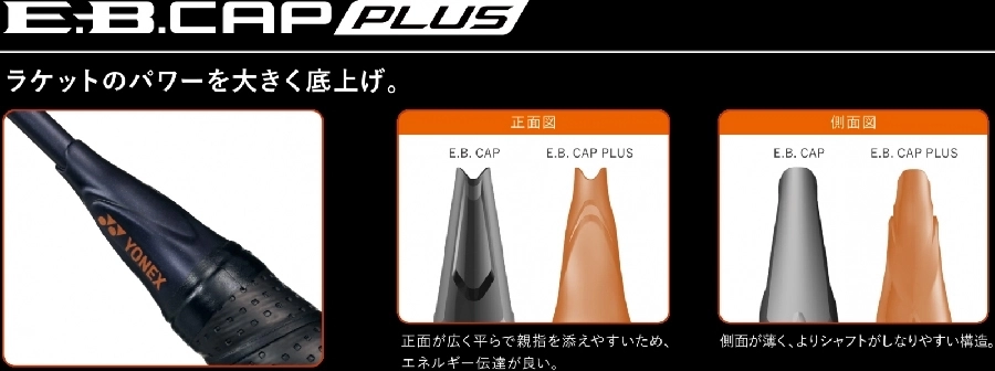 - ENERGY BOOST CAP PLUS: Mũ chụp cán vợt với thiết kế độc đáo cho phép thân vợt uốn cong, đồng thời ổn định mặt vợt, hạn chế xoắn và tăng cường hiệu suất truyền năng lượng.