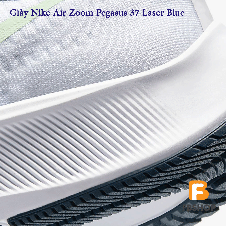 - Phần đế ngoài của đôi giày Nike Air Zoom Pegasus 37 Laser Blue nổi bật với các đường vân tinh tế, lượn sóng tăng độ ma sát tuyệt đối cho đôi giày, làm bằng cao su bền và mũi giày được gia cố giúp chống mài mòn.
