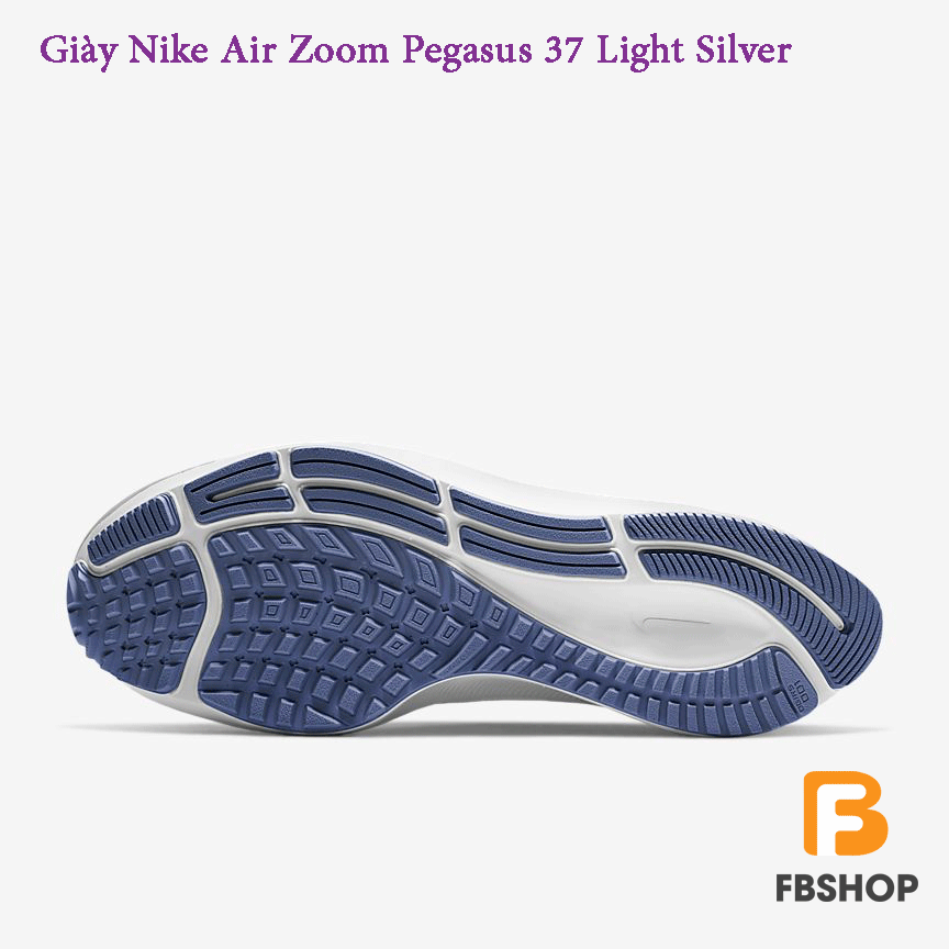 - Phần đế ngoài của đôi giày Nike Air Zoom Pegasus 37 Light Silver nổi bật với các đường vân tinh tế, lượn sóng tăng độ ma sát tuyệt đối cho đôi giày, làm bằng cao su bền và mũi giày được gia cố giúp chống mài mòn.