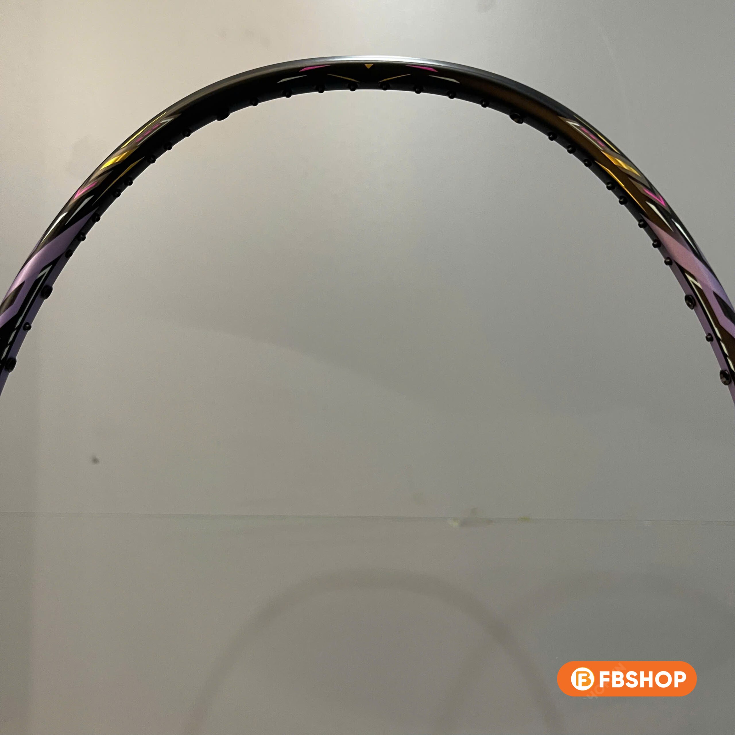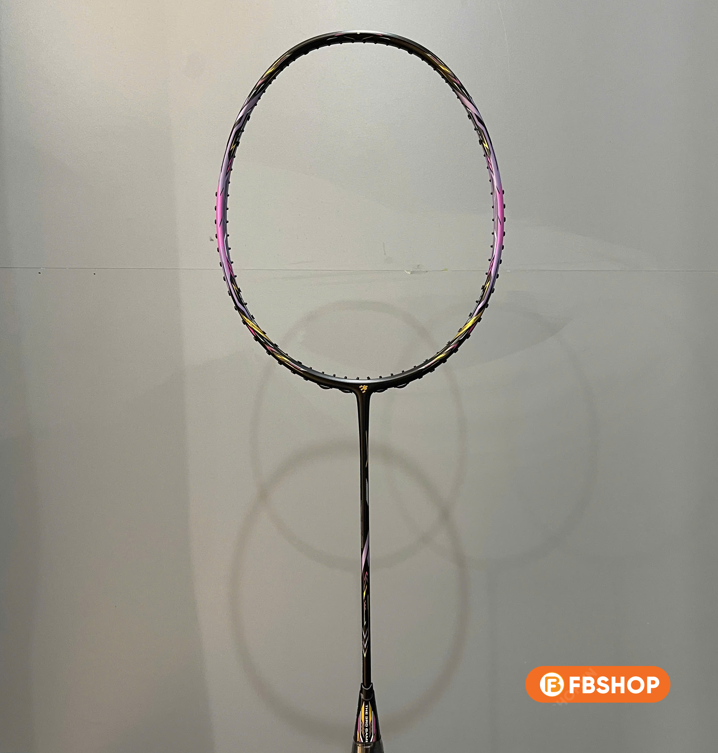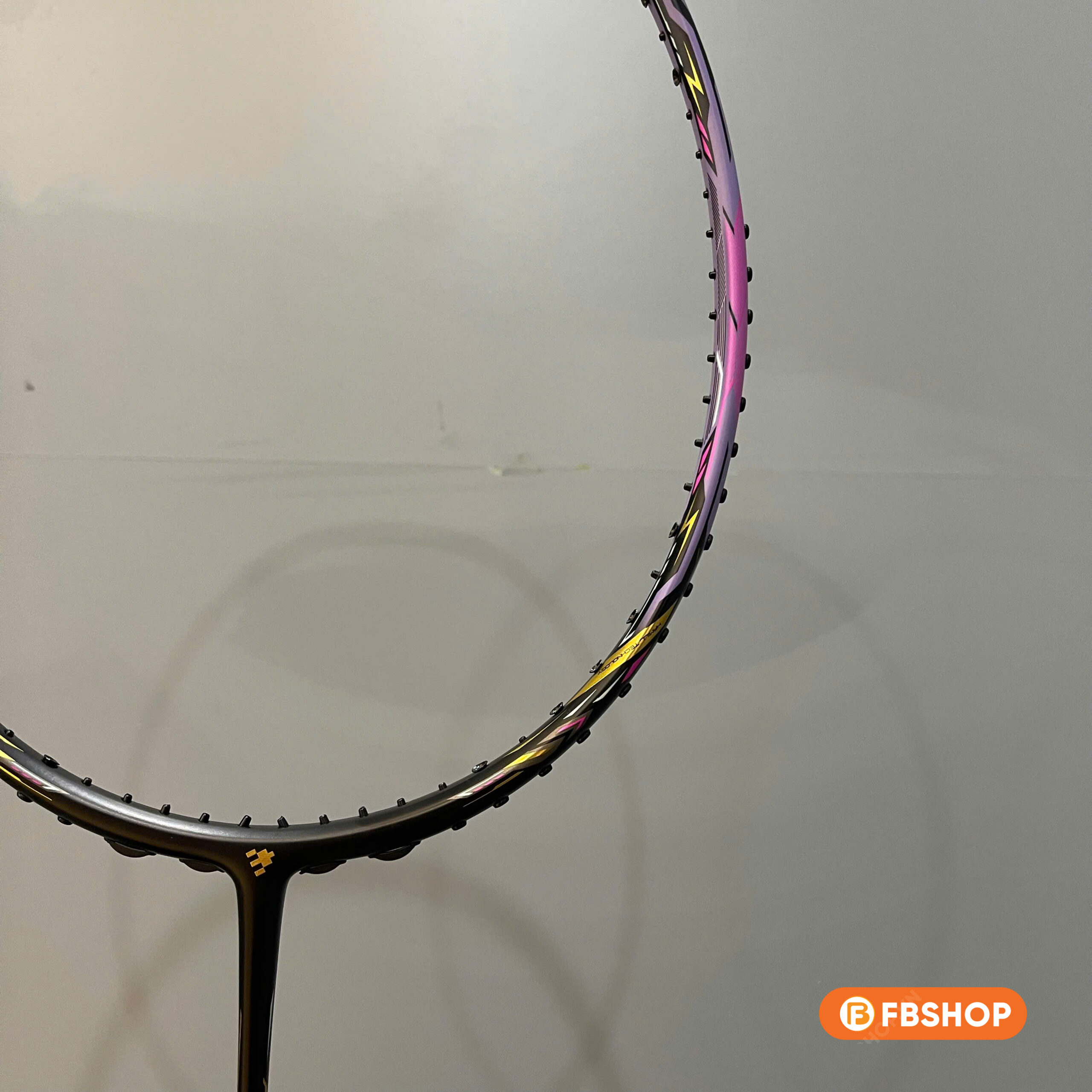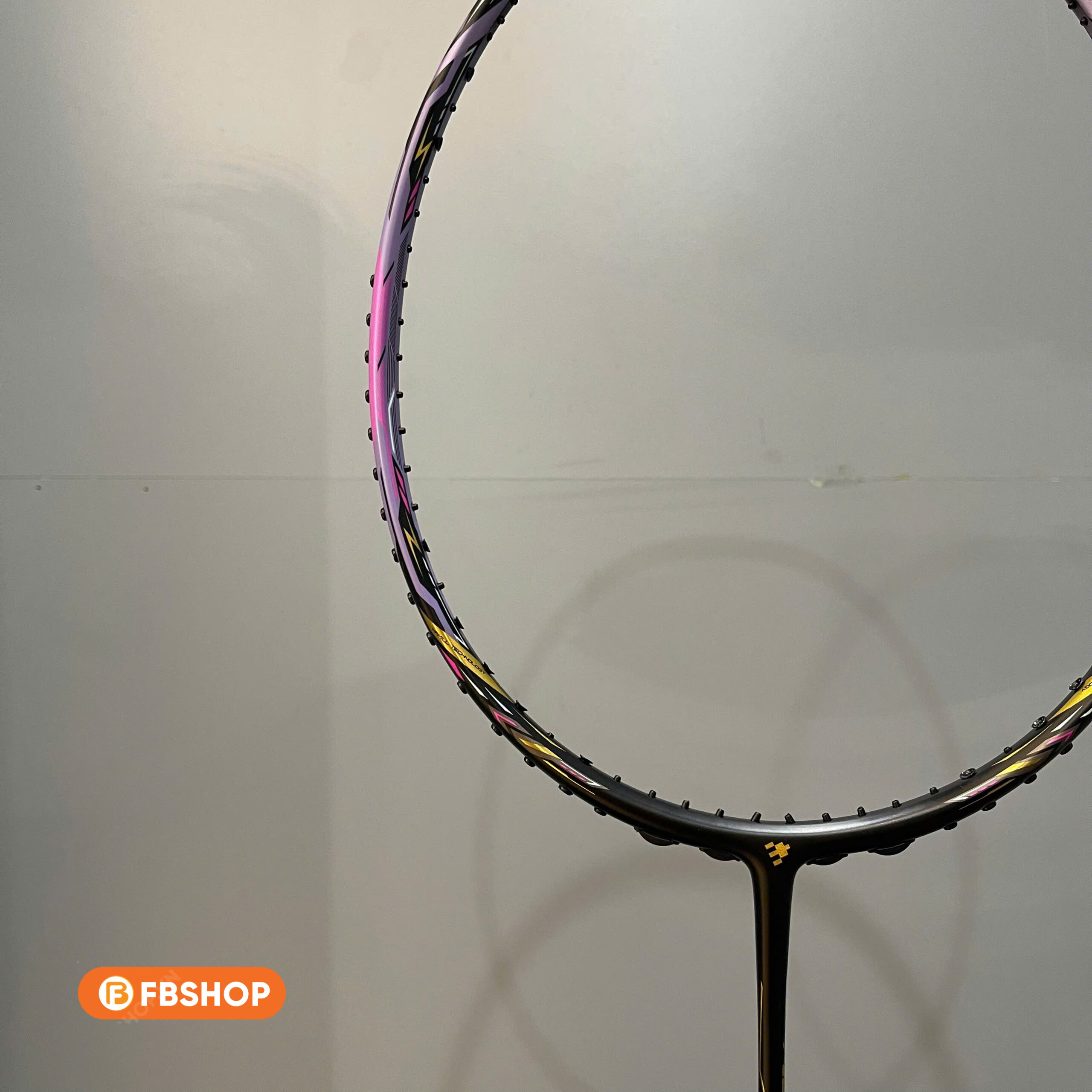 - Lớp sơn chủ đạo là màu đen – tím, tạo nên một hiệu ứng thị giác cực kỳ cuốn hút dưới ánh đèn sân đấu. Chi tiết viền vàng kim xen kẽ tạo cảm giác cao cấp, nổi bật mà không quá sặc sỡ. Logo và họa tiết trên thân vợt được in sắc nét với lớp sơn phản quang nhẹ – tạo điểm nhấn tinh tế nhưng đầy cá tính.