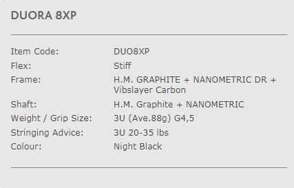 - Vợt cầu lông Yonex Duora 8XP là cây vợt nặng đầu, thân cứng, khối lượng vợt nặng vừa.