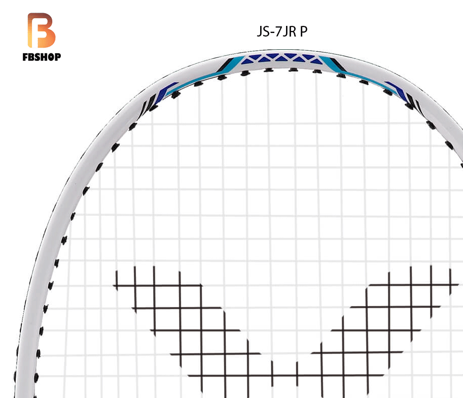 - Vợt victor js 7jr p – mặt trênMặt trên của vợt có nền chủ đạo là màu trắng và viền xanh